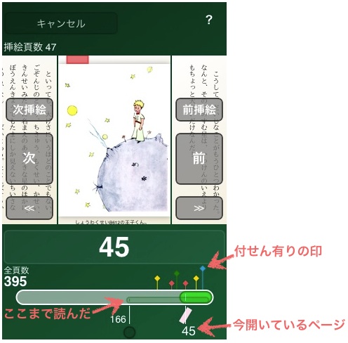 戻った時に降車駅に到着するなど読書を中断したとしても「自動付せん」がどこまで読んだかを自動的に記憶します。